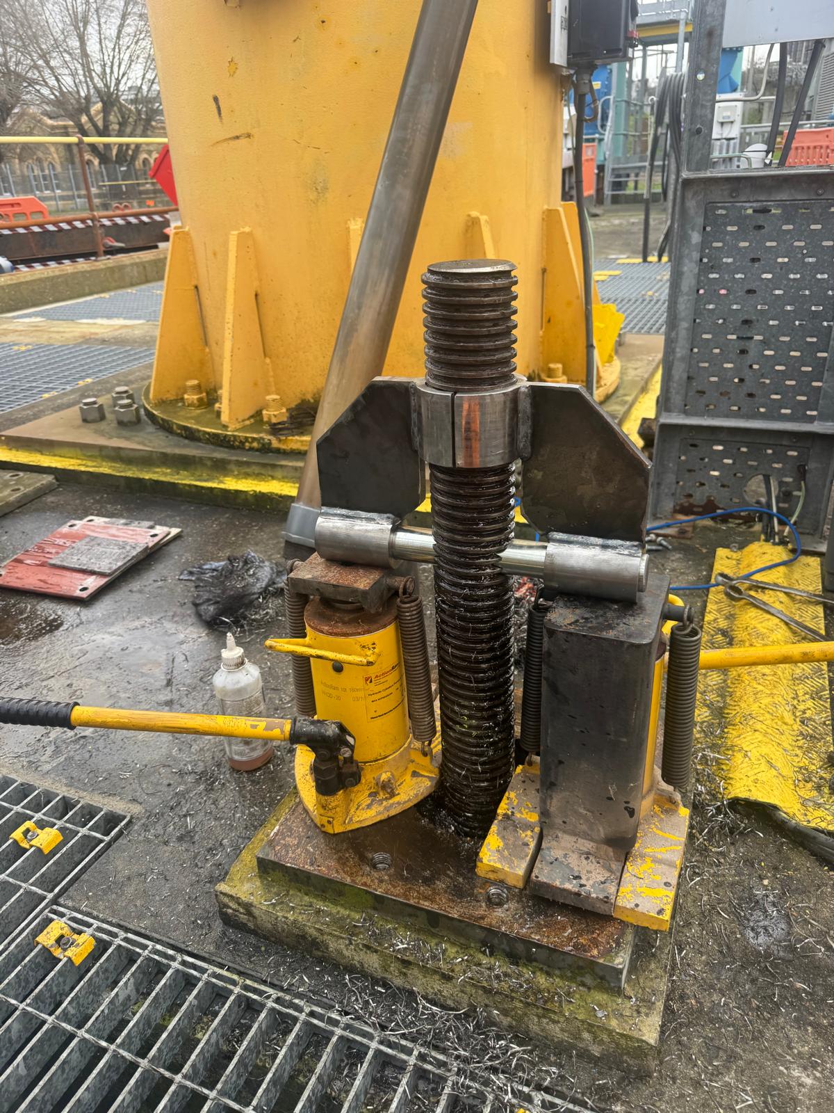 To get proper grip and apply load safely, we designed a purpose-made drilling jig to drill accurately through the penstock actuator spindle. This created a secure fixing point for the bespoke recovery device, allowing controlled lifting forces to be applied without slipping.