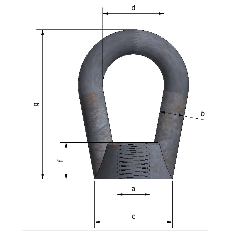 Safe Working Load (t)Diameter thread a (mm)Diameter eye b (mm)Diameter base c (mm)Width eye inside d (mm)Base height f (mm)Height overall g (mm)