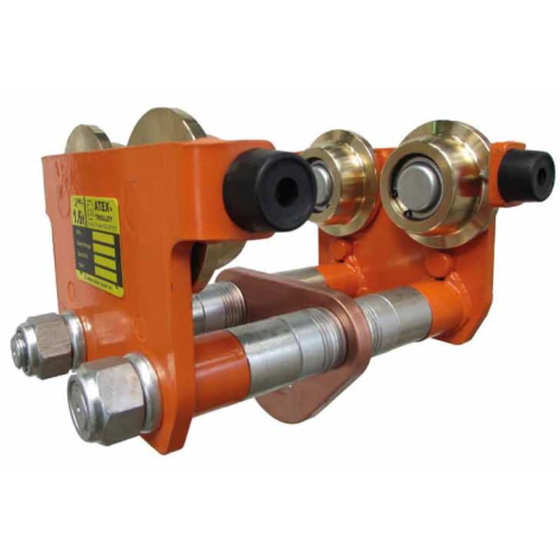 This high quality trolley range is precision engineered so that it works for W.L.L. capacities from 500kg up to 2 tonnes. The ATEX push trolley enables exact positioning or easy traversing of large loads with manual hoists.